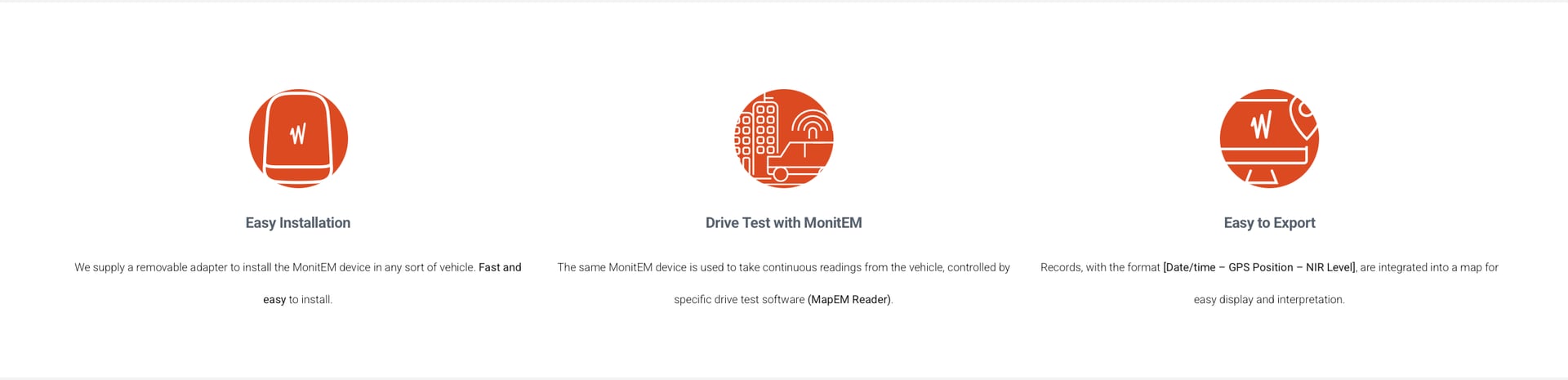MapEM devices have an environmental protection rating of IP 66, the highest in its class, meaning that they are dust tight and resistant to powerful water jets. A protection rating of IP 66 is indispensable for vehicle-mounted equipment, since they must work outdoors while exposed to precipitation of any intensity and air-borne particles (dust and vehicle emissions).